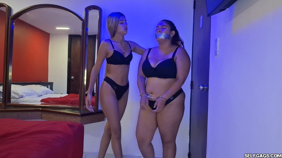 Claudia, a gorgeous BBW submissive, is brought in wearing only her underwear — wrists cuffed in front, a strip of duct tape sealing her mouth. Anastasia, dressed in lingerie and socks, leads her calmly to the edge of the bed — fully in control.