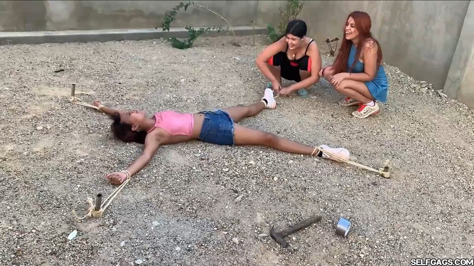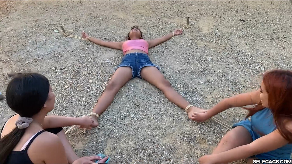 In no time, Penelopé is tied spread-eagle on the ground in a perfect X, her shoes and socks removed, and her bare feet totally exposed. She’s upset and demanding to be let go — but the girls are just getting started.