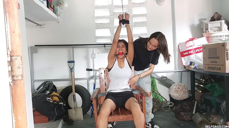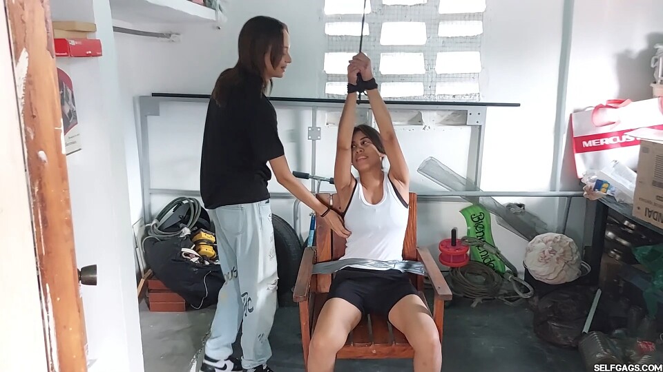 Maia Aranda exacts sweet revenge: her step-cousin Jasmin Aranda is securely duct-taped to a chair in the attic - ankles and thighs bound tight, barefoot, arms pulled high overhead with armpits completely exposed.