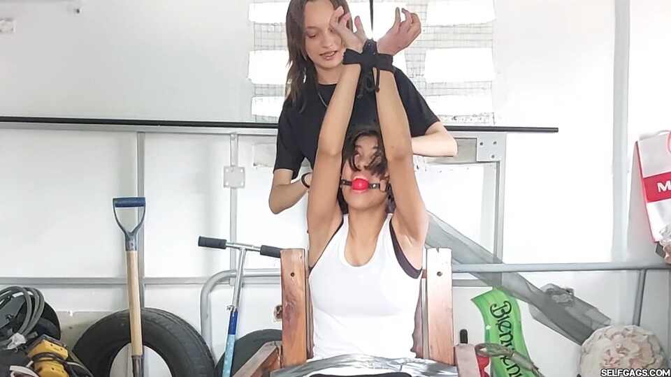 To quiet the chaos, Maia clamps a hand firmly over Jasmin's mouth while keeping up the relentless tickling. Then she buckles a red ballgag deep and snug into Jasmin's mouth, continuing the ruthless assault on all her ticklish spots until Jasmin is reduced to a trembling, sweat-drenched heap of muffled giggles and exhausted squirms.