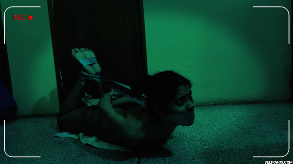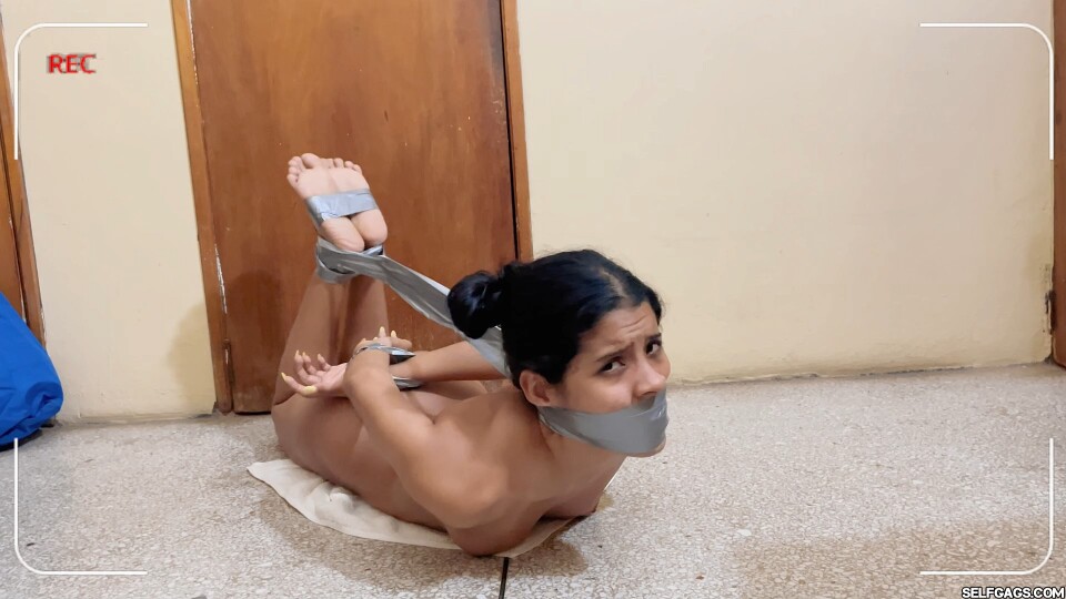 The Latina girl lies nude and hogtied on the concrete floor: wrists and ankles duct-taped behind her back, soles bound together, and mouth wrapped securely to her heels for total gagging. The feed shows her emotional rollercoaster—initial anger in fierce wriggles, shifting to submissive compliance, then tearful sobs and desperate begs directed at the camera lens, eyes pleading for release that you ignore.