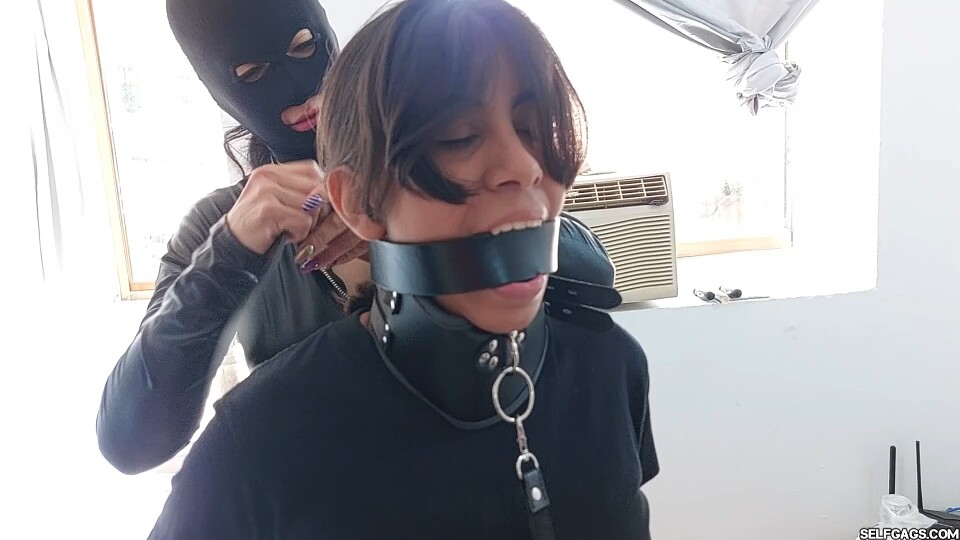 Sent by Jasmin's step-mother for strict discipline, Laura handcuffs Jasmin's wrists behind her back, and adds a posture collar and leash for total submission. She secures a tight black belt gag with firm face slaps as Jasmin vocalizes uncomfort.
