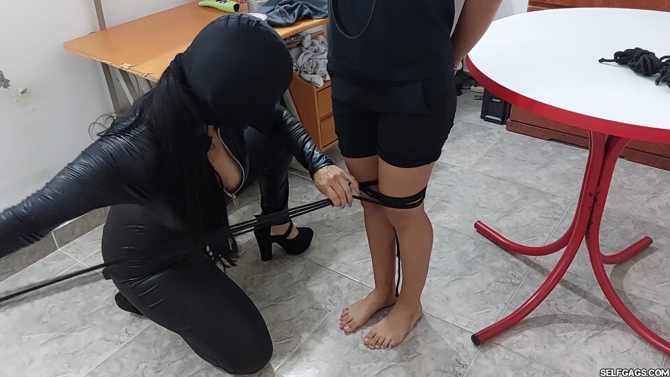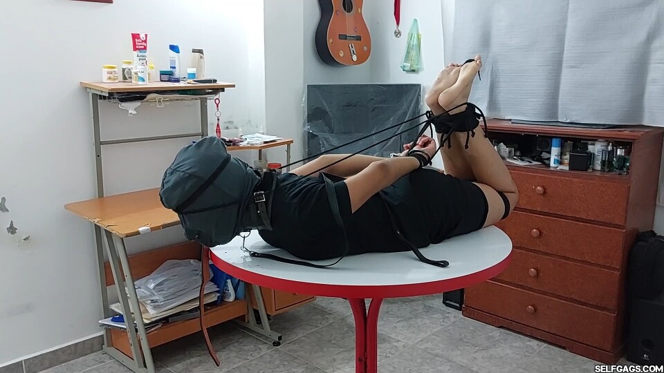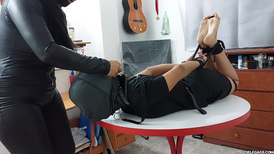 Laura leads Jasmin to a table for ankle and leg bondage with black rope, and puts her in a rigorous hogtie linking wrists, ankles, and hood to arch her body. She binds her toes with nice close-ups of Jasmin's dirty feet.